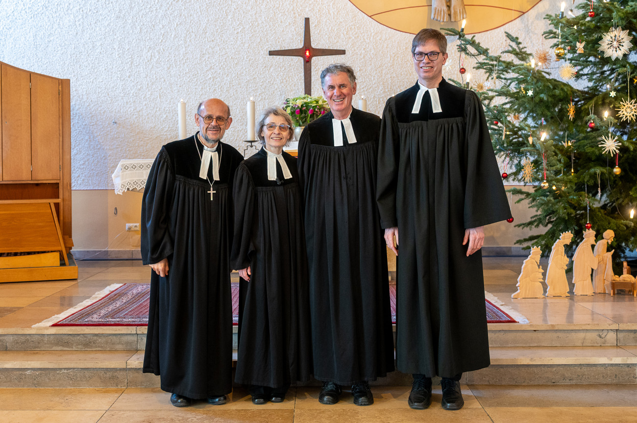 Auf dem Foto von links nach rechts: Dekan Jürgen Hacker, Pfarrerin Birgit Bauer, Ehemann Pfarrer i.R. Gerhard Bauer, Pfarrer Friedemann Wenzke