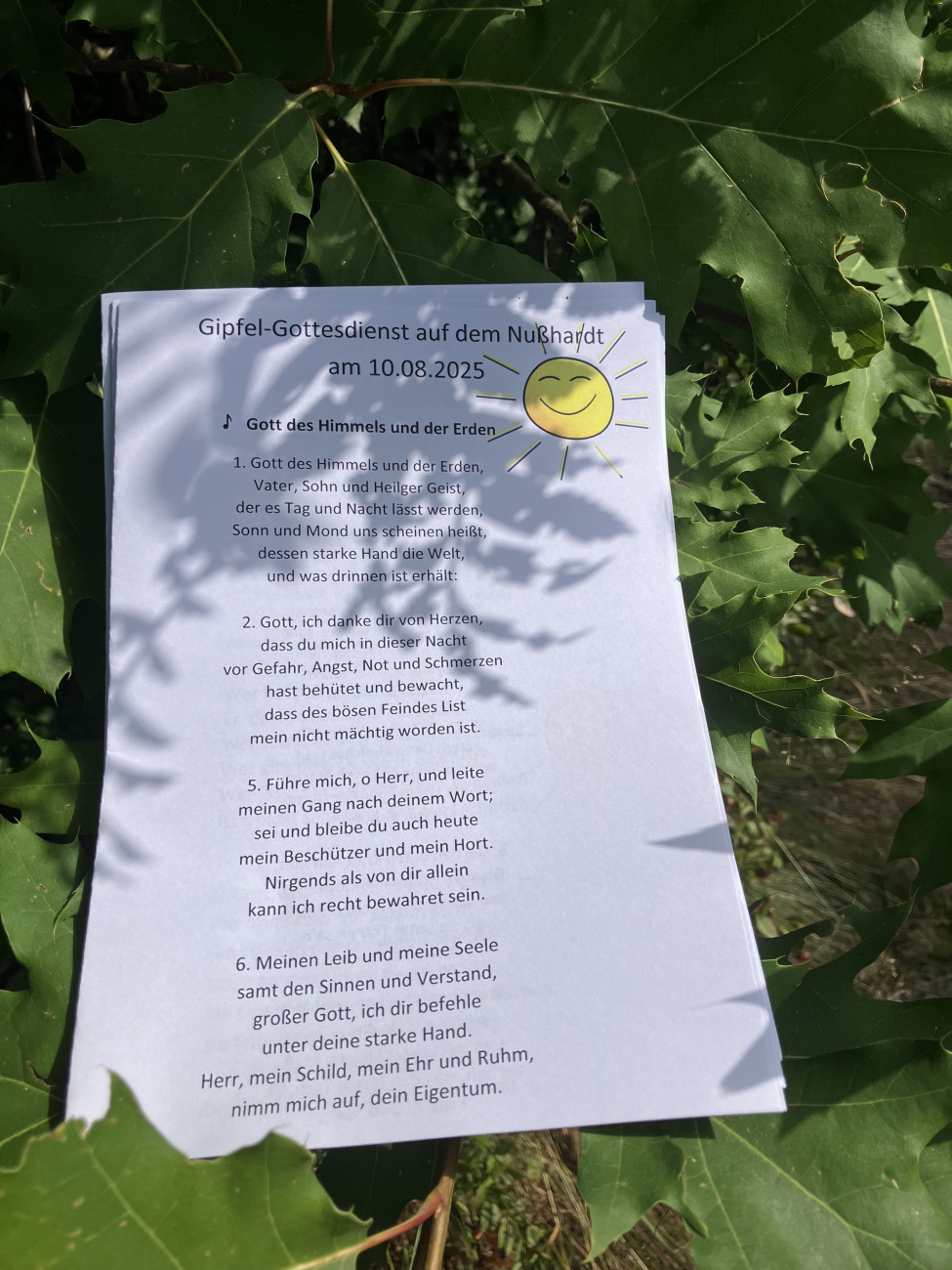 Gemeindeglieder aus der ganzen Region sowie Gäste und Touristen kamen am 10. August zum Gottesdienst knapp unterhalb des Nußhardt-Gipfels zusammen. Ungefähr 80 Gottesdienstbesucher verteilten sich über das Gelände und machten es sich z.T. auf dem Boden bequem. Bei herrlichem Wetter und perfektem Sonnenschein waren sie entweder mit dem Fahrrad angefahren oder mindestens 45 Minuten zu Fuß gelaufen.